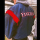 Perfekt erhaltene Yankee-Baseballjacke in Blau und Weiß in Größe M.