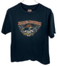 VINTAGE BLACK HARLEY DAVIDSON GRAPHIC TEE WITH BLUE MOTOR AND WOMAN, SIZE L